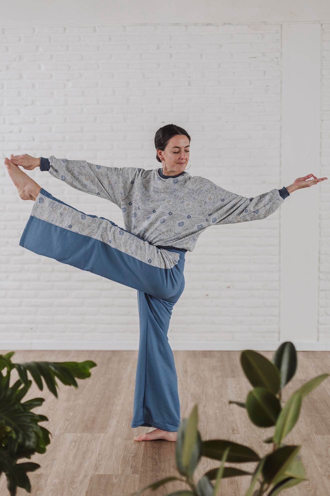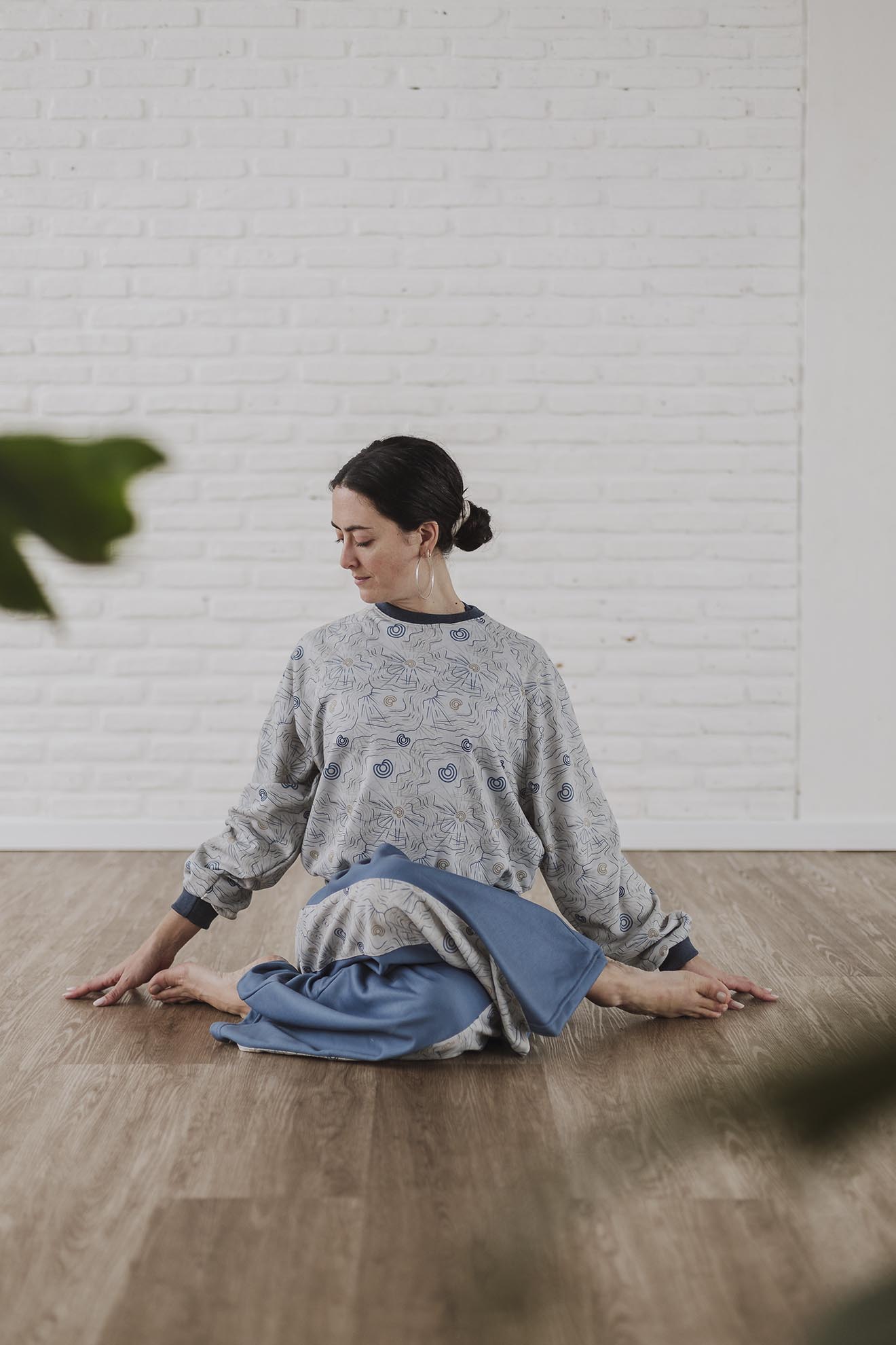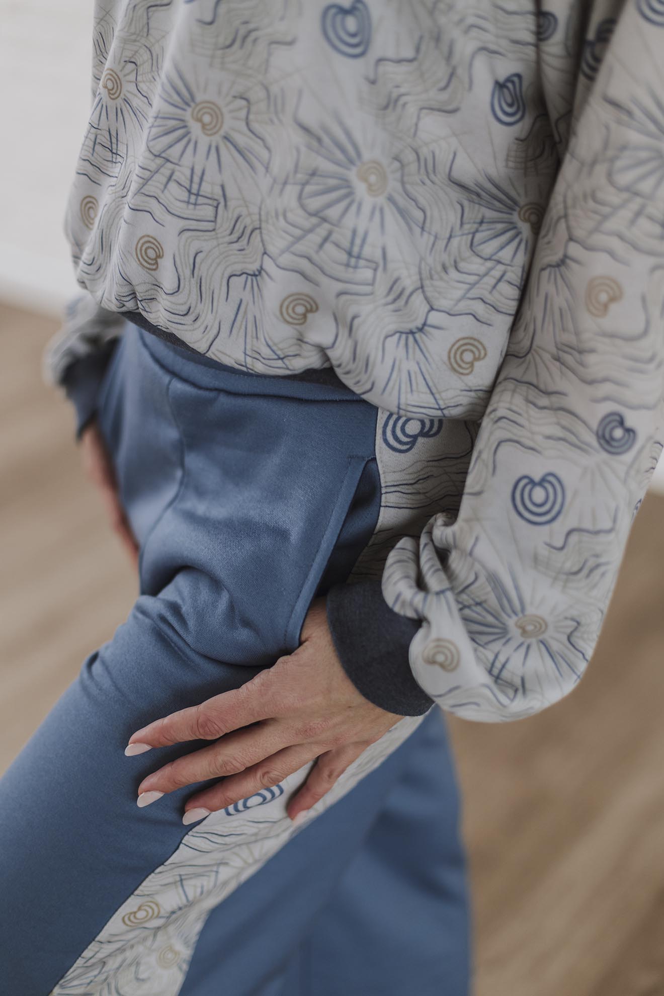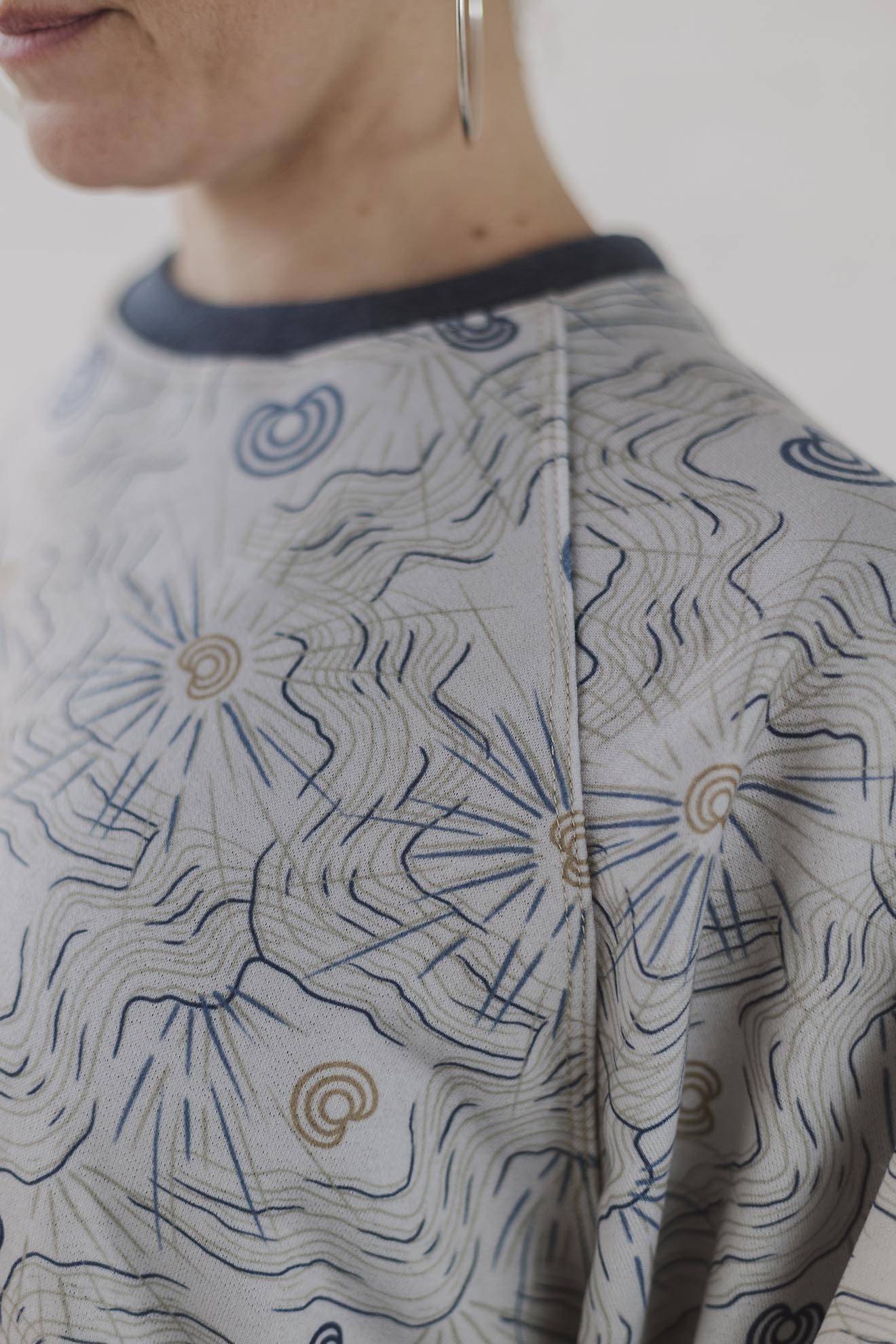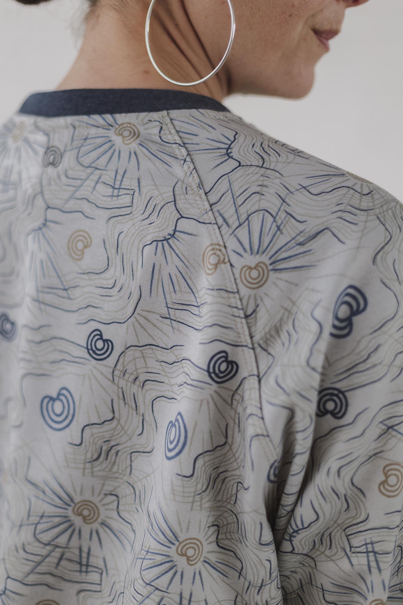 Buzo largo hasta la cadera con silueta súper descontracturada. Queda bien amplio en el cuerpo y se ajusta con un puño en la cintura. Sus mangas ranglan se ensanchan en la sisa dándole mucha onda. Está confeccionado en rústico de algodón y poliéster muy suave y confortable. Viene sublimado íntegramente con la estampa Destello.