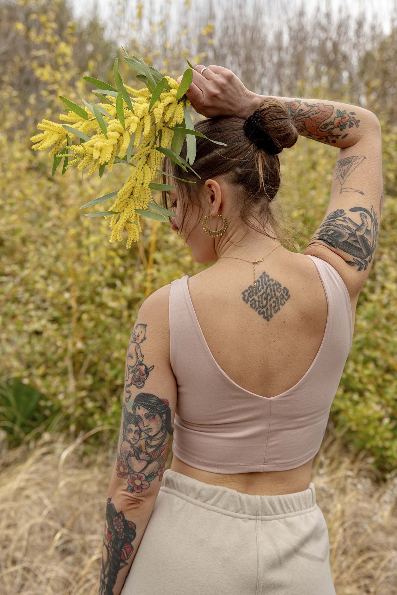 Remera crop sin mangas, escote en v con corpiño interno incorporado para mejor sujeción ofreciendo la posibilidad de no usar top debajo. Pensado específicamente para la práctica: te permite moverte libremente e invertir, quedando siempre dónde debe estar. Brinda la comodidad y sostén de un Top, pero viste como una remera. Su espalda trae un escote profundo muy hermoso y delicado que suma frescura. Confeccionado en algodón elastizado.