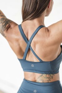 Top con breteles reforzados y cruzados en la espalda. Diseñado específicamente para prácticas de movimiento, dando libertad a tu espalda y omóplatos. Su largo es unos cm debajo del busto, cerradito al cuello. ¡Favorece mucho si tenés poco busto! Y además de cómodo es súper lindo.
